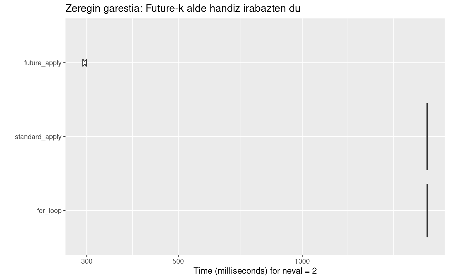 forbegizta estandarra: Eskuzko iterazioa (aurre-esleitua).lapply: R-ko estandar funtzional eta sekuentziala.future_lapply: Bertsio paralelizatua.